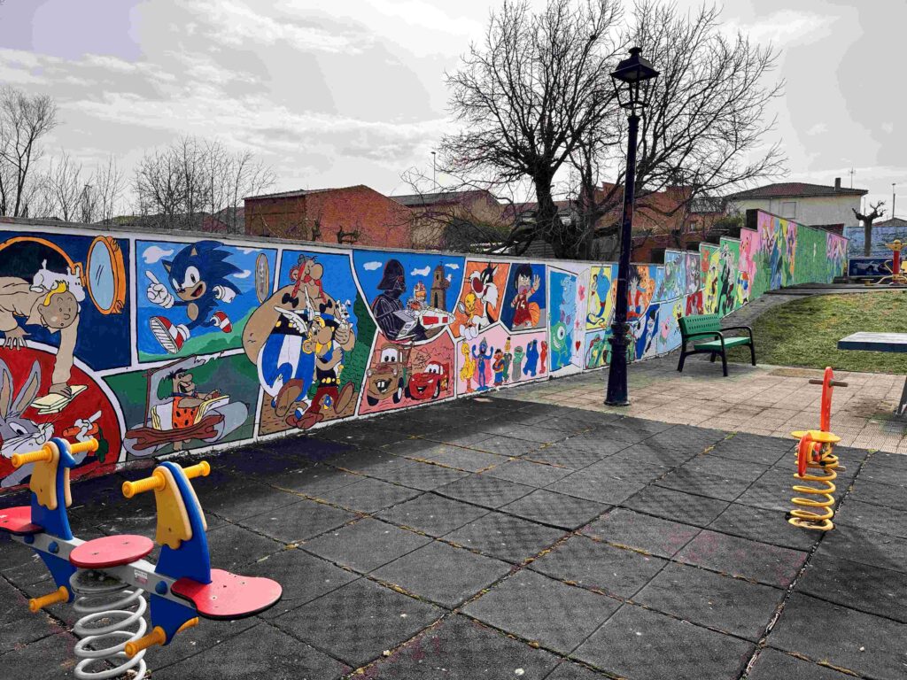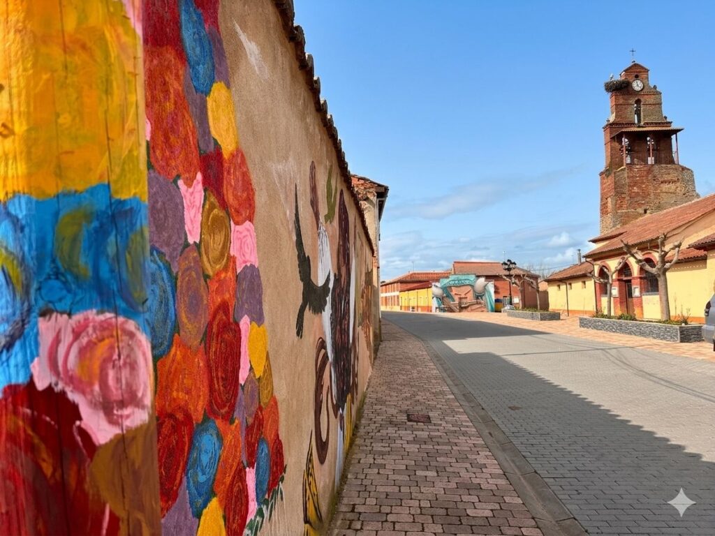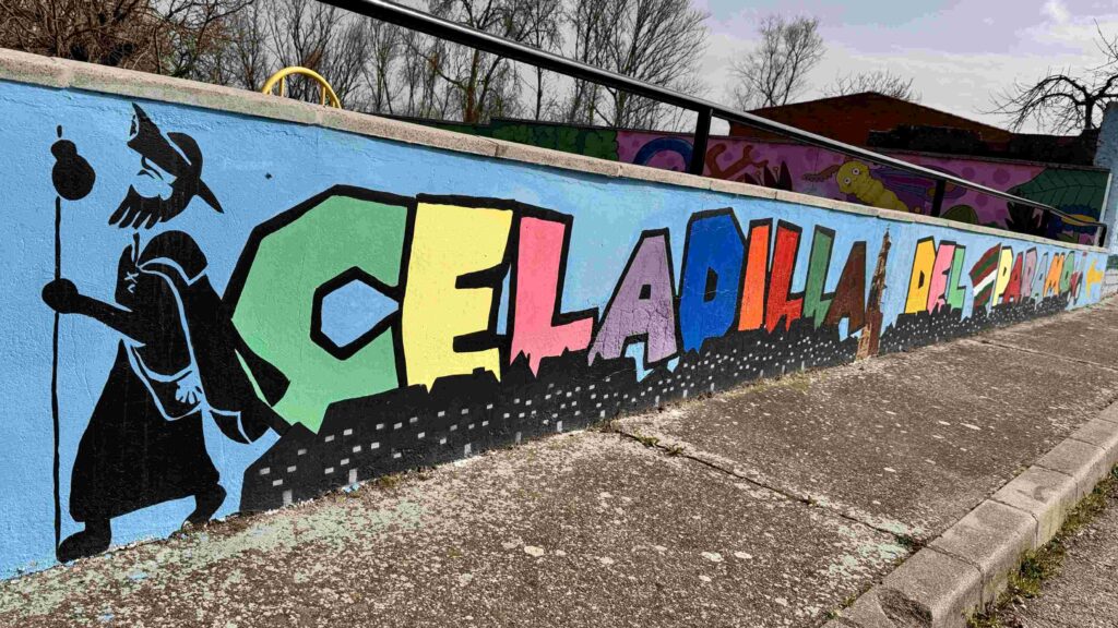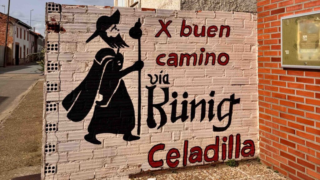 Llegamos por la parte superior a Celadilla del Páramo, la llamada «Aldea Künig» por su alta implicación en todo lo referente a la Vía Künig. En ella podremos contemplar los abundantes murales que decoran multitud de paredes y su iglesia parroquial. Justo antes de ella giramos a la derecha por la calle Puesto para llegar al sorprendente parque infantil decorado con murales de todos nuestros héroes infantiles.