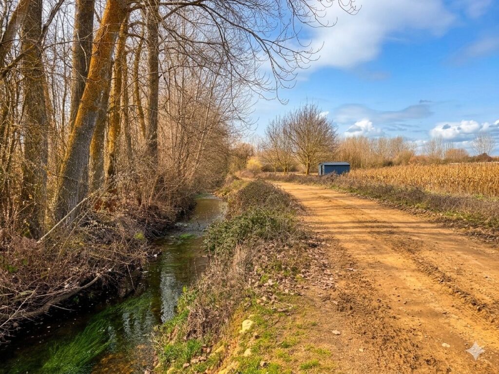 Un kilómetro después cruzamos el puente sobre el río Órbigo por la pasarela dejando atrás el municipio de Santa Marina del Rey para adentrarnos en el de Benavides. Después del puente seguimos caminando por el margen izquierdo de la carretera y cogeremos el primer camino a la izquierda que nos llevará pegados al cauce de río Órbigo y entre parcelas de maíz, lúpulo, trigo, alubias y patatas, directos a Benavides.