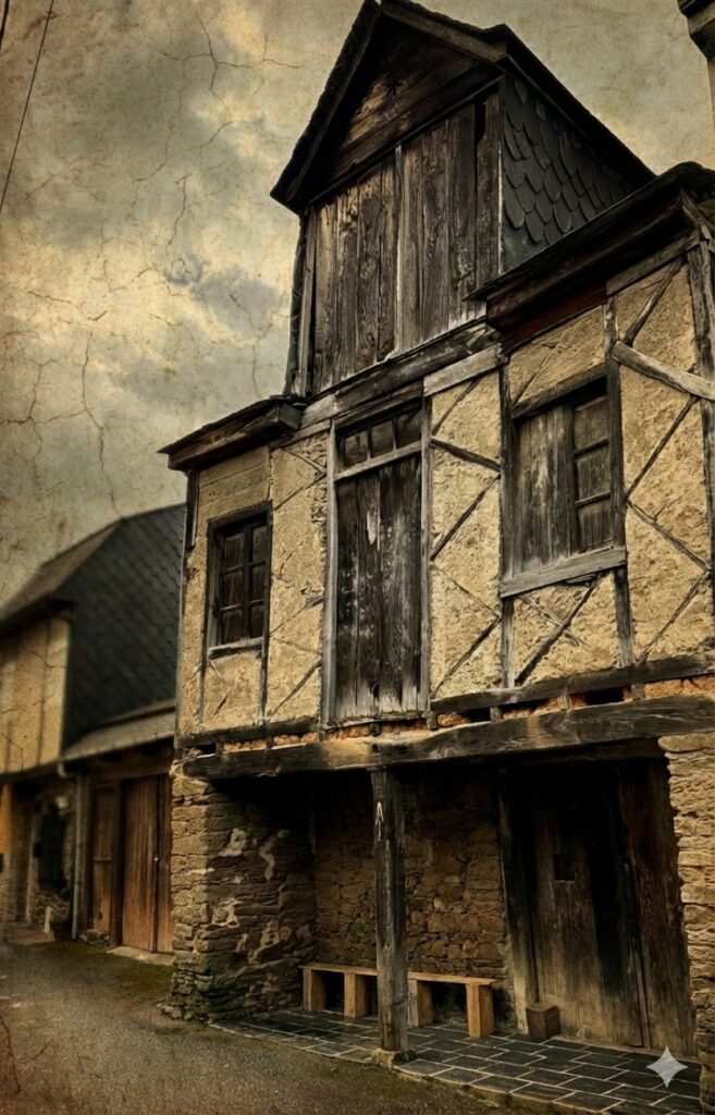 La construcción de Albares que aparece en la imagen muestra la típica casa de estilo tradicional de la región montañosa de León común durante los siglos XVII y XVIII. Está construida con un entramado de madera y adobe, que fue común en zonas rurales de la provincia durante esos siglos.